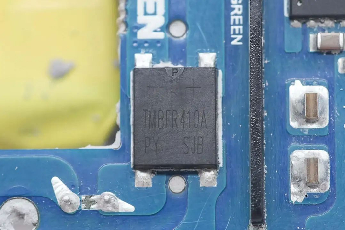 整流桥来自平伟,型号TMBFR410A,规格为1000V 4A,采用TMBF封装。
