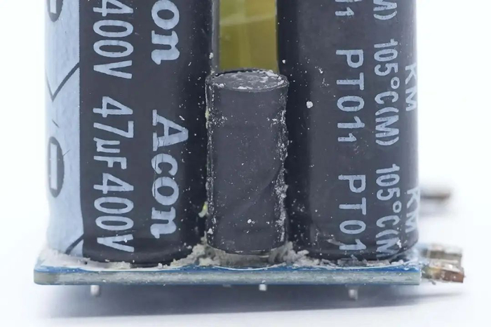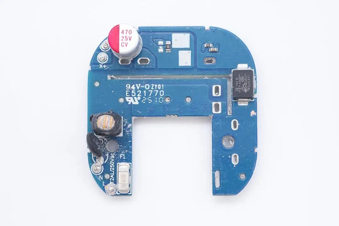 底部小板设有保险丝,NTC热敏电阻,共模电感,贴片Y电容和滤波固态电容。