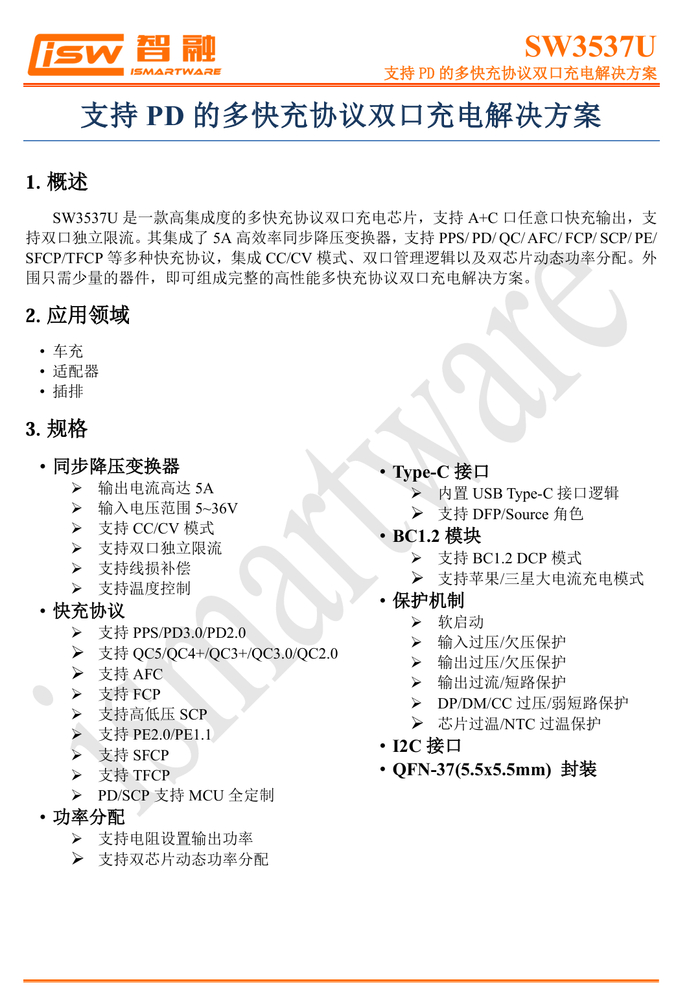 得益于芯片的高集成度,SW3537U将传统降压方案中的协议芯片,同步降压控制器和降压MOS管全部集成在一个封装内部,大大简化了多口快充的电路设计,芯片支持A+C双口快充应用,具备完善的保护功能,采用QFN-37封装。