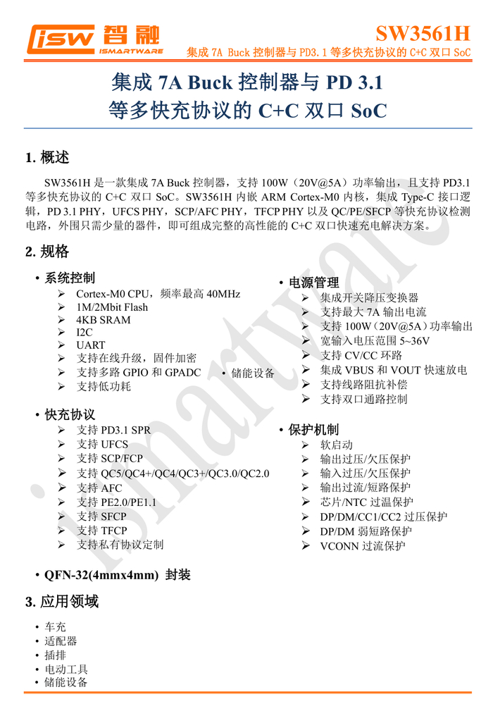 智融SW3561H支持双USB-C口通路控制,支持线损补偿,搭配两颗同步降压开关管和对应接口的VBUS开关管即可实现双口降压输出。芯片内置的降压转换器默认工作频率为180KHz,支持定制工作频率,支持100W功率输出,满足小体积设计。芯片集成过热保护,输入输出过压/欠压保护,输出过流保护以及数据引脚过压保护等完善的保护机制,采用QFN-32封装。