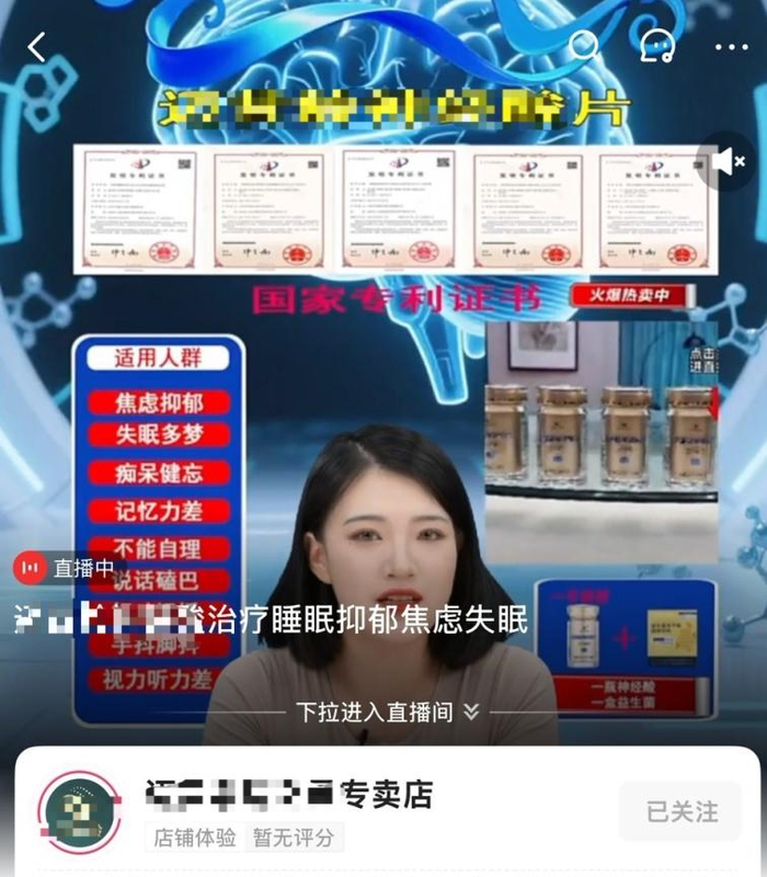 “XX牌神经酸,治疗抑郁焦虑失眠……”一个直播间的标题如此写道,作为保健食品,这样的说法显然已经违背了《广告法》中,“保健食品广告不能涉及疾病预防、治疗功能”的要求。更为离谱的是,记者在市场监督管理总局的特殊食品信息查询平台,输入这款产品的信息,无论是品牌名还是“神经酸”,都没有对应的产品信息。