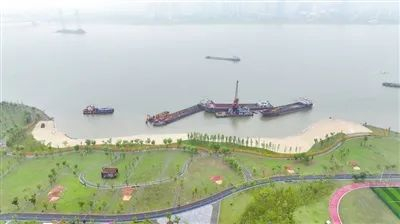 记者驱车至朝阳江滩公园西南侧停车场,沿台阶下行即达万紫滩和千红滩天然泳场。现场可见万紫滩和千红滩天然泳场沙子已经铺设好,且万紫滩天然泳场摆放了7把救生椅,还有一台挖掘机正在两个泳场与江上小岛之间修筑道路。