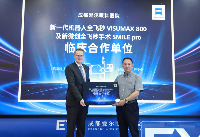 新一代机器人全飞秒VISUMAX 800及新微创全飞秒手术SMILE pro新技术在蔡司大中华区CFO Axel Christian、蔡司医疗中国屈光负责人李宁先生、爱尔眼科四川省区副总院长周进、成都爱尔眼科医院院长胡建斌的见证下启动!