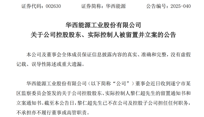 实控人被留置并立案 华西能源称尚未知悉相关事项具体情况