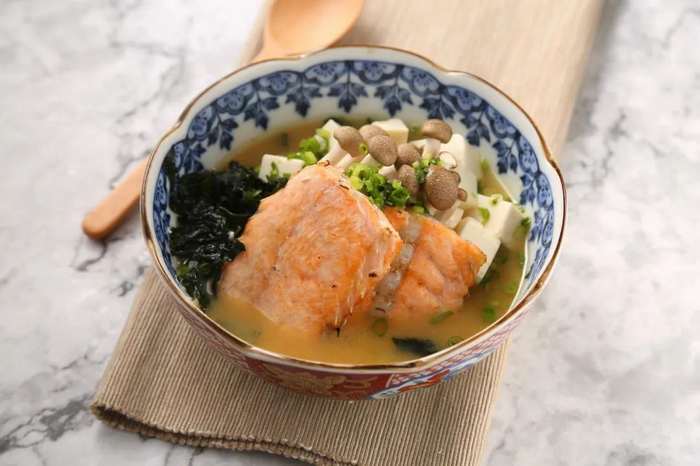 关键点:要想口感软嫩,记得先将三文鱼煮 2 分钟后捞出,汤中加蔬菜煮至近熟后,再次放入三文鱼煮 3~5 分钟即可。