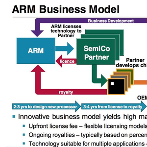 作为全球最 大的IP公司,Arm在过去的大部分时间里都是通过把自己的产品“授权”给用户,收取授权费(license )和版税(royalty)作为主要盈利模式的。其中,授权费可以简单看作Arm将其设计授权给你所收取的第 一笔费用,至于授权的产品可以分为“Architecture license”(如苹果和高通就是这样授权,他们可以在Arm的框架下自定义其产品)和“IP license”(就是把公司设计好的Cortex系列处理器授权给用户)。至于版税,则简单理解为在你授权了Arm的产品并设计量产芯片后,每卖出一颗芯片,需要支付给Arm的费用。