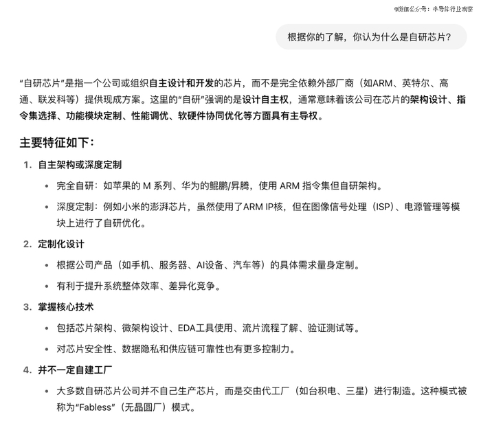 最后,就是否“自研”这个话题,我们稍稍讨论一下。关于什么是“自研芯片,其实这并没有很严格的定义。为此,我就这个问题咨询了ChatGPT,得到了以下回复。