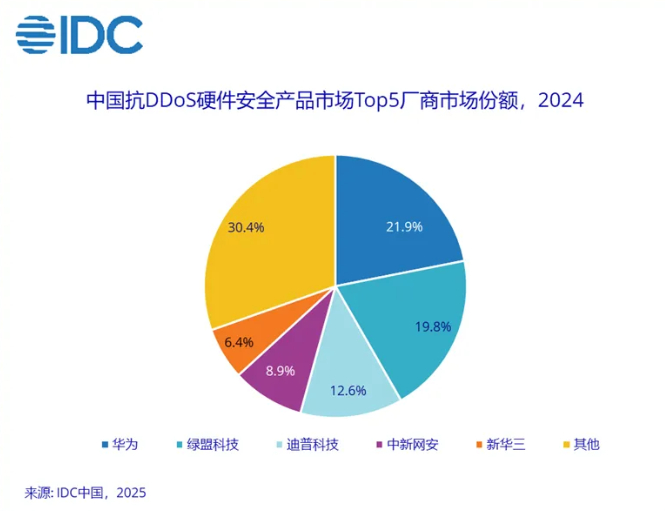 IDC报告称,2024年中国抗DDoS硬件市场规模约6.8亿元,同比增长2%;公有云抗DDoS市场规模约23亿元,同比增长5.5%。
