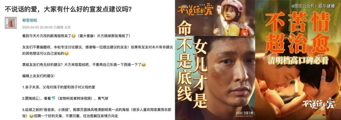 电影圈无创意宣发久矣,群众都比贵圈会提炼热点。网友发帖建议《不说话的爱》宣发往“小孩姐、爸爸弟”“张艺兴又被诈骗了”“雨夜撞车悬疑戏”等方向走,洗掉影片最初给人的苦情、催泪、沉重印象。硬糖君深以为然,怎样整都比现在不痛不痒地主打“治愈”slogan强。像“治愈”这种已经用滥了的词,基本就等于无效信息,有任何人会被其吸引吗?不劝退就不错了。