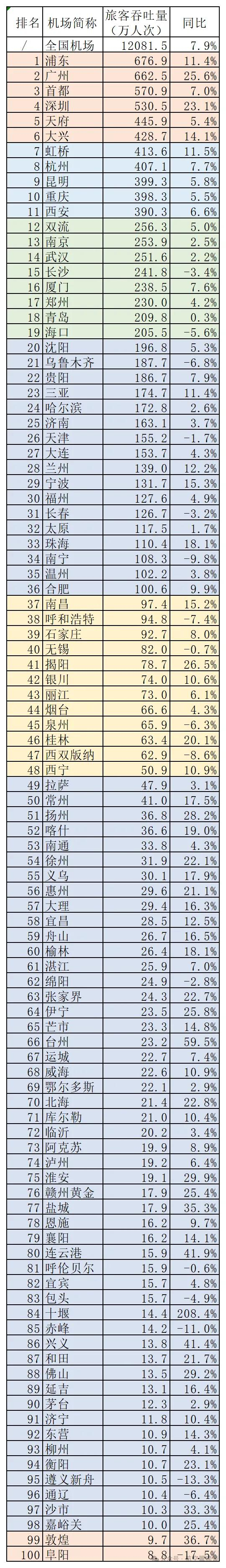 这6大机场排名基本已定,虽然可能月度之间还有些变化。