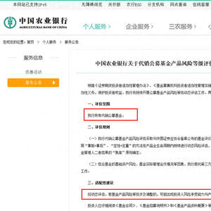 日前,中国农业银行在官网发布了关于代销公募基金产品风险等级评价及动态评估规则的公告。