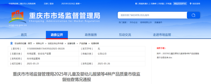 重庆市市场监督管理局发布2025年儿童及婴幼儿服装等4种产品质量市级监督抽查情况通报