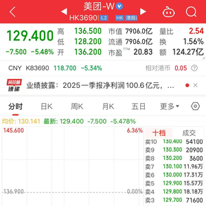 盘面上,截至港股今日收盘,美团股价跌5.48%,报129.4港元/股,总市值7906亿港元。
