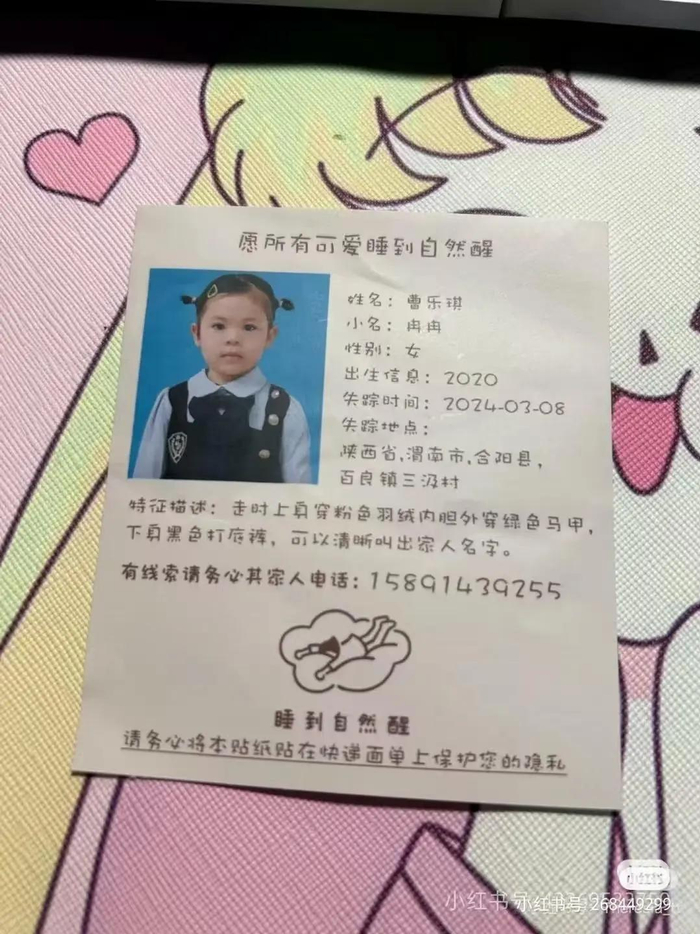 记者通过发的告示上的联系方式,联系上曹乐琪的爷爷,对方表示,家里也看到了类似消息,但仔细对比后,应该不是乐琪。采访中记者了解到,曹乐琪家住陕西省渭南合阳县百良镇三汲村,2024年3月8日下午3点左右,她在自家门口玩耍时丢失,走失前身穿粉色羽绒内胆绿色马甲,下身穿黑色打底裤,可清晰说出家人名字。女孩走失后,当地警方专门成立了办案组,但眼下一年多了,女童至今仍未找到。