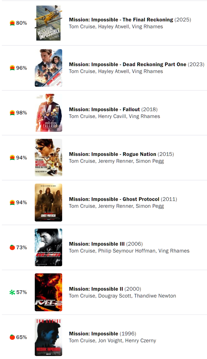 《碟中谍8》在“烂番茄”上的新鲜度仅好于该系列的前三部。