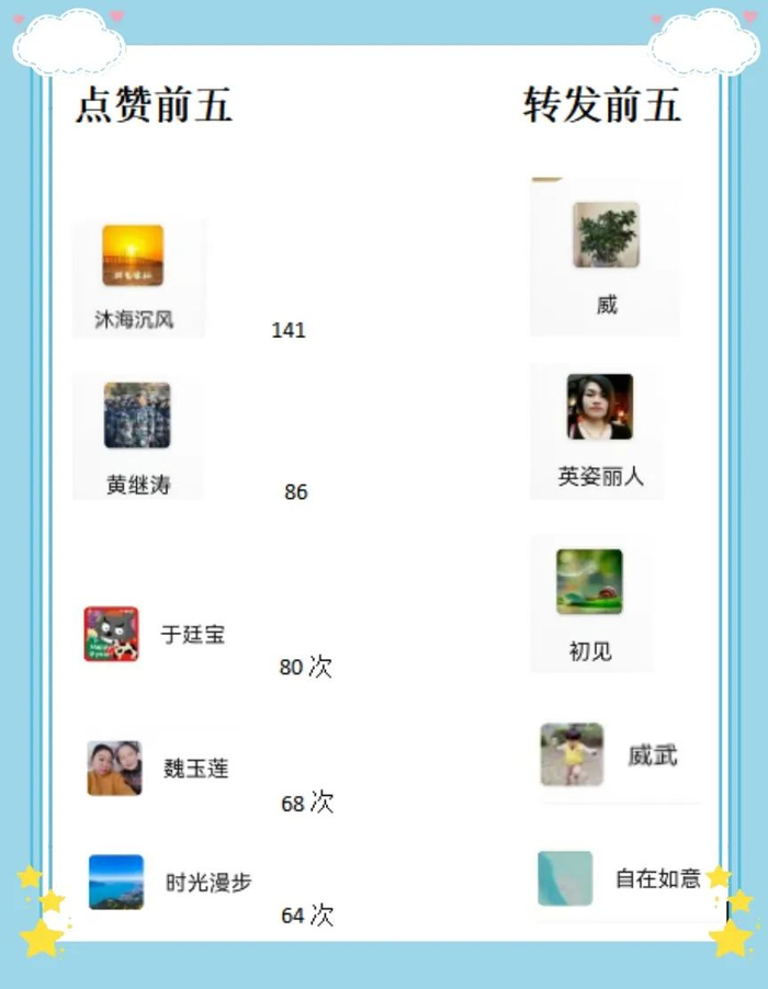 根据最近两天后台数据,公布上期10名中奖名单,分别是点赞👍前五名和转发前五名: