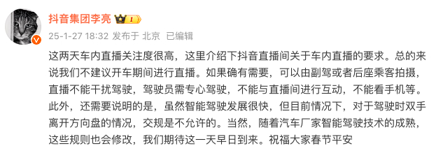1月27日,抖音集团副总裁李亮发文表示:“如确有需要,可以由副驾或者后座乘客拍摄,直播不能干扰驾驶。驾驶员需专心驾驶,不能与直播间进行互动,不能看手机等。”