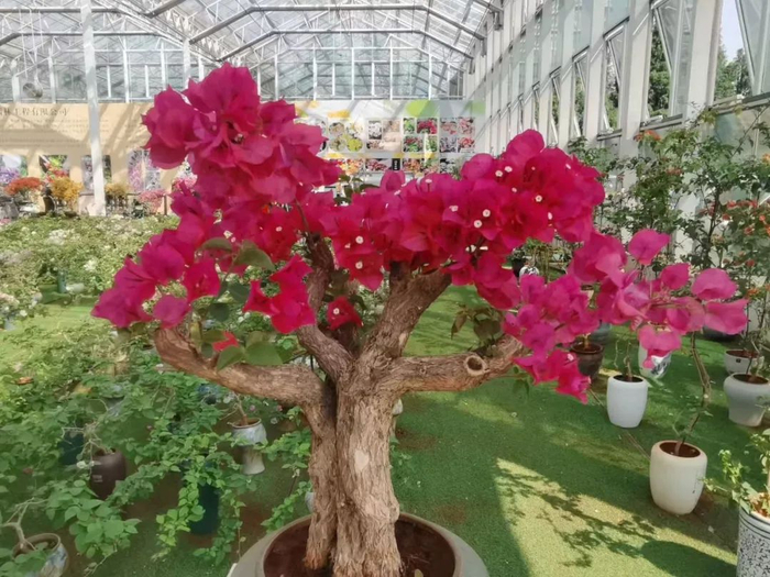 花朵簇拥压冠的大型盆栽三角梅