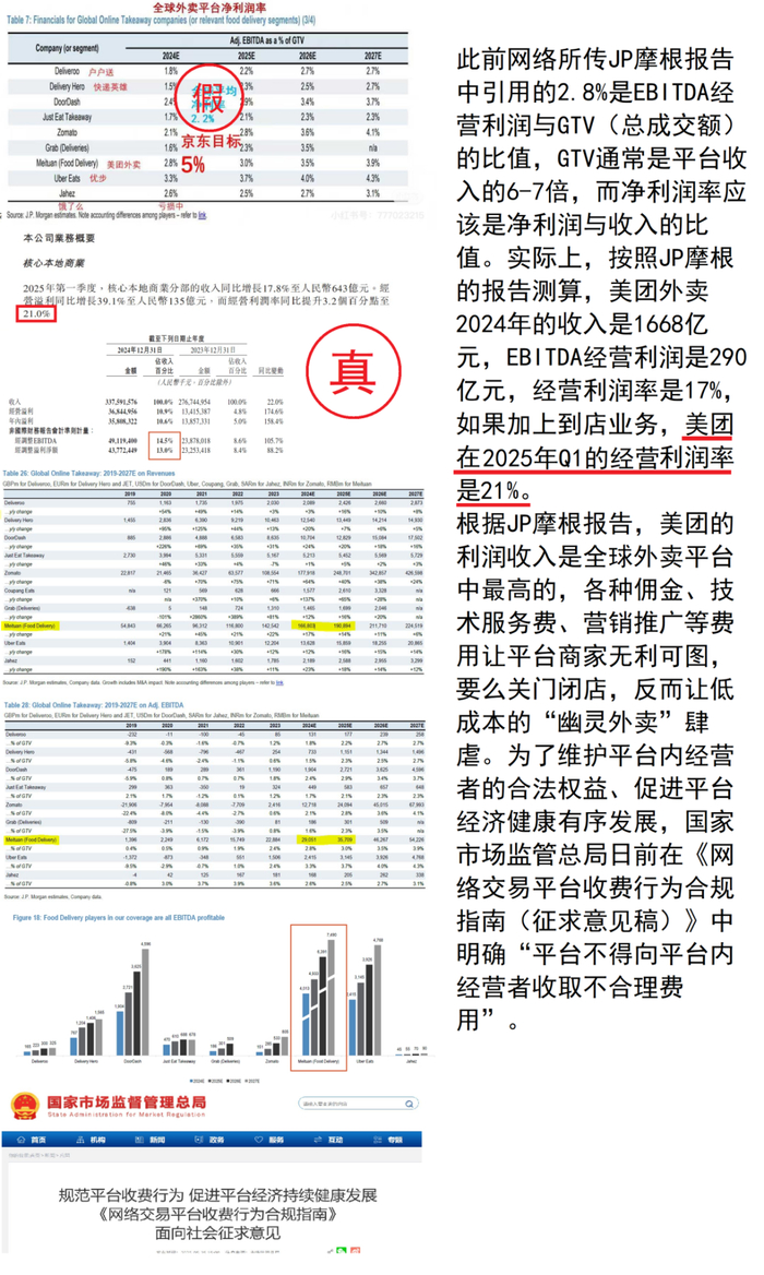 其实,这是一个很大的误解。美团外卖所谓的2.8%的净利润率数字,来源于JP摩根发布的全球在线外卖行业报告(《Global Online Takeaway (2024)》)。但是,其提到的2.8%,是美团2024年的经营利润(EBITA)与总成交额(GTV)的比值,严格意义来说,这不是净利润率。真正的净利润率,应该是净利润与收入的比值。通常来说,GTV是平台收入的6-7倍。