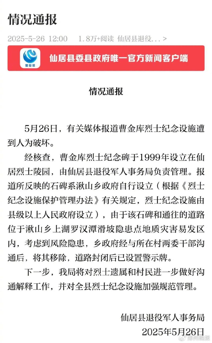 5月26日,针对“有关媒体报道曹金库烈士纪念设施遭到人为破坏”引发关注一事,当地官方回应:并非破坏,因灾害移除。系误会,没有和烈士亲属做好沟通。