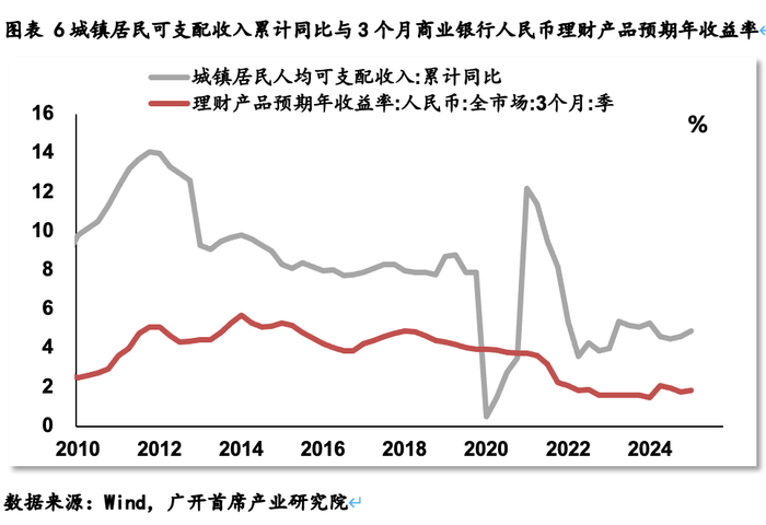 图表2城镇居民可支配收入累计同比与3个月商业银行人民币理财产品预期年收益率