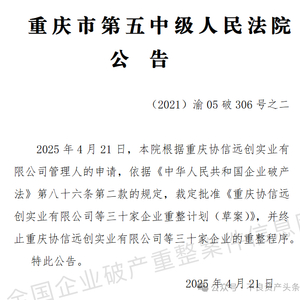 这标志着协信已经完成了破产重整的关键一步。4月21日,重庆五中院发布公告批准该草案。