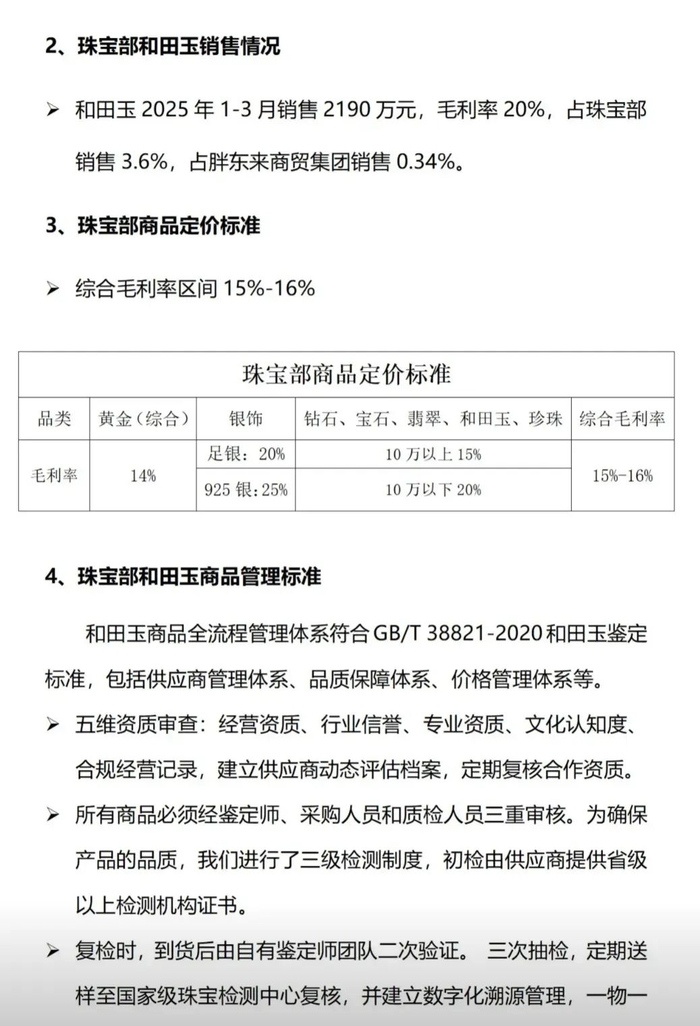 “胖东来公开 2025 年一季度和田玉销售额仅2190万元,毛利率20%,远低于行业平均水平(30%-50%)。”