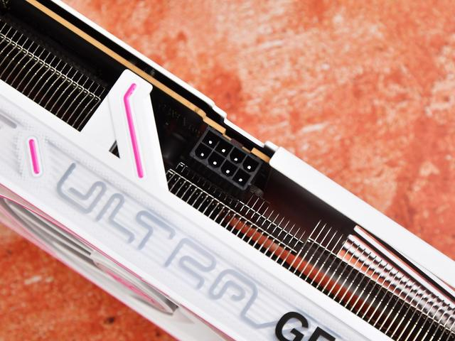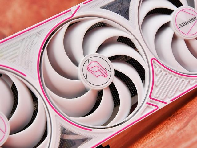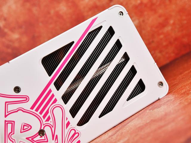 白色外甲,粉色描边元素为产品注入青春活力。渐变风格也得以继承,呈现方式由直接的“镭射”转变为柔美的“珠光” ,能随着光线的变化而产生渐变。显卡外甲当中有许多规律的弯曲线条,给予视觉上的律动感。