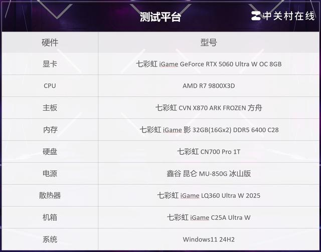 首先介绍一下测试平台,除了本次测试的显卡,搭配的CPU为AMD 锐龙 7 9800X3D,主板为七彩虹的CVN X870 ARK FROZEN 方舟,采用14+2+1相供电,并加入了显卡易拆装置;内存为七彩虹iGame 影DDR5 6400C28,系统版本为24H2。