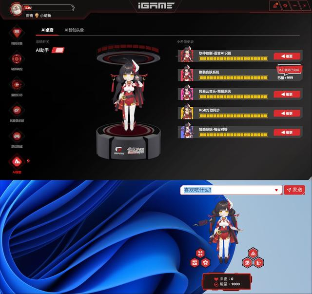 此外,iGame自在星球还提供了智能又好玩的AI桌宠:柒小希,提供了情绪陪伴和语言交互,并有音乐模式,冒险模式,精简模式等多种模式供玩家选择,帮助玩家提升不同场景的沉浸感。