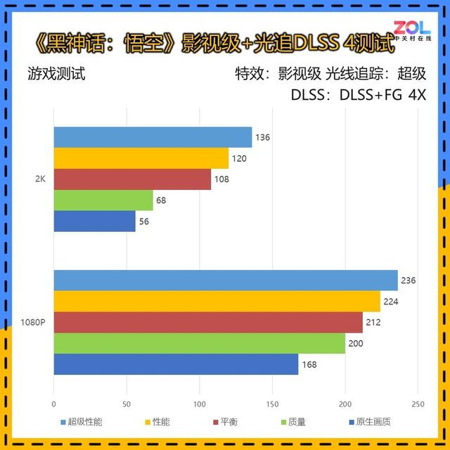 不过虽然测试中2K DLSS 4 4X超级性能中依然能达到136帧的成绩,但延迟相对较高,对于有完美躲闪判定的《黑神话:悟空》来说,会感觉不太“跟手”,建议选择1080p分辨率体验电竞级的超高帧率。