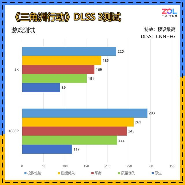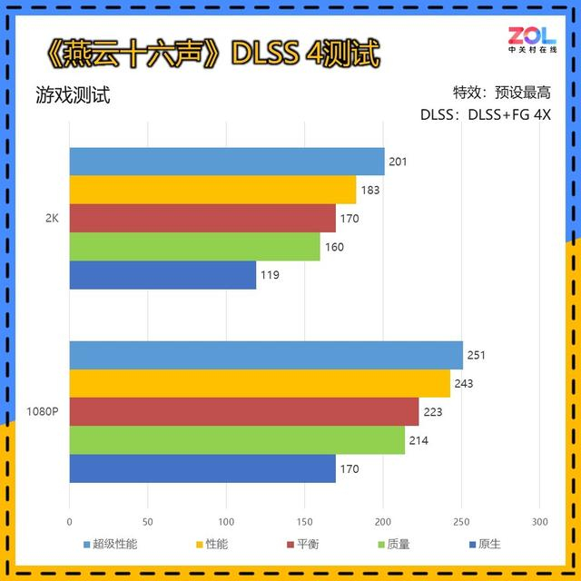 在DLSS 4 4X多帧生成中,2K分辨率自超级质量模式起已经达到200帧以上。