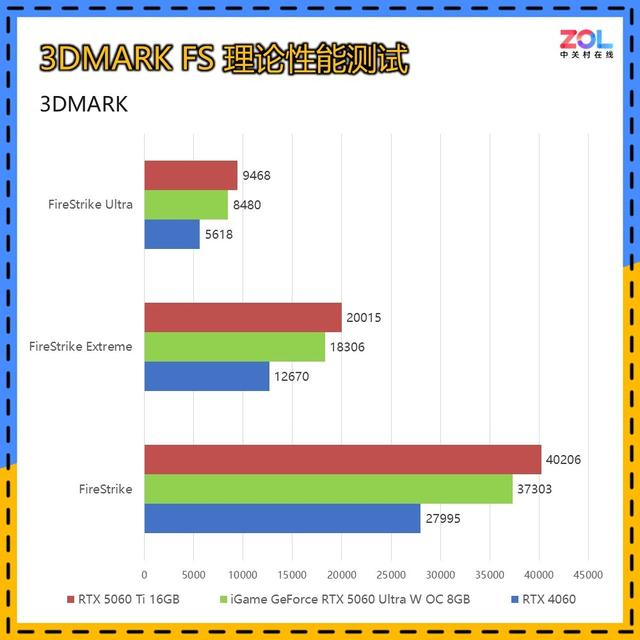 在针对显卡DX11性能的3DMARK FS套装测试中,iGame GeForce RTX 5060 Ultra W OC 8GB在三档分辨率中相较RTX 4060提升分别为,33%/44%/51%,综合提升约为43%。而相比RTX 5060 Ti 16GB的差距为7%/9%/10%,综合约为9%。
