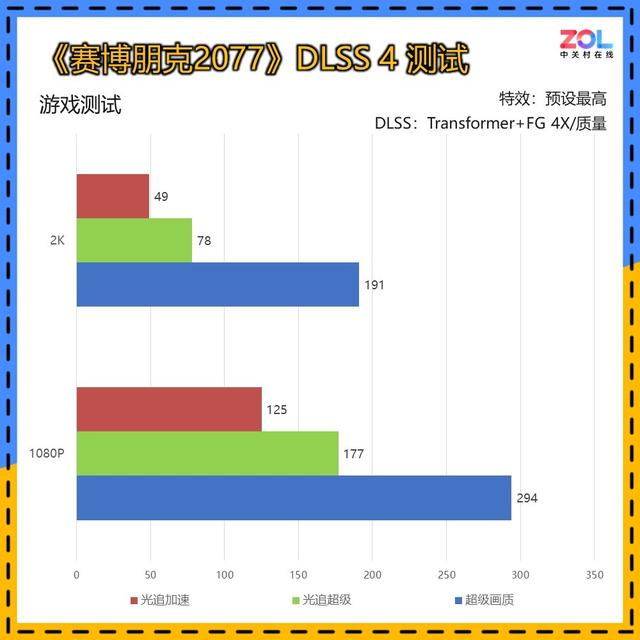 DLSS 4的测试为Transformer模型4X帧生成模式,可以看到在2K分辨率下,超级画质也能达到191帧的成绩,提升达到133%。
