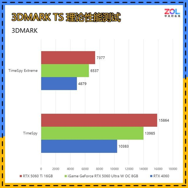 而在针对DX12环境下的Time Spy和Time Spy Extreme测试中,iGame GeForce RTX 5060 Ultra W OC 8GB相较RTX 4060的提升分别为:TS提升35%;TSE提升34%,综合提升约为35%。相比RTX 5060 Ti 16GB的差距为12%/11%,综合约为12%。