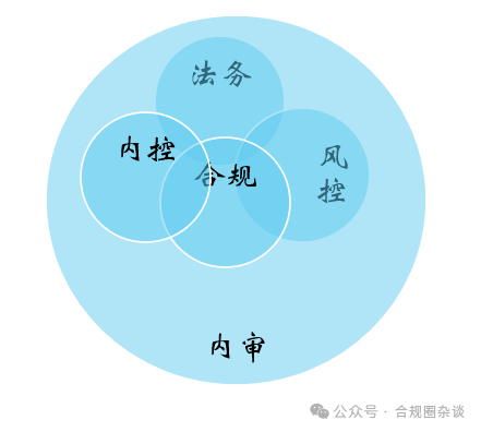 不太能够理解这个几个职能的“大于”排序关系,引用的说法为“合规是最基本的,内控是主体,风控是最高层面的”。这个逻辑依然很费解,如果指的是范围,几个职能各司其责,在某个部分上的交集不必然决定哪一个工作范围大还是小,还是说风控的工作多合规的工作少,还是谁的工作更重要?实在解释不通。如果非要弄出几者关系的子丑寅卯来,我能想到的相对最合适的图解就是几个彼此交叠的圆。内审最大,因为可以审计一切。