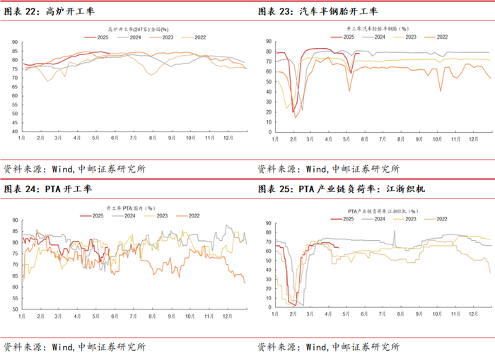 中下游生产有所放缓,汽车半钢胎开工率和PTA开工率环比增速转负。截至5月22日,5月平均周度汽车轮胎(半钢胎)开工率为71.83%,较4月同期平均开工率回落7.37pct,较去年同期下降7.34pct;截至5月22日,PTA(国内)开工率为74.98%,较4月同期平均开工率下降3.31pct,但较去年同期回升4.2pct。