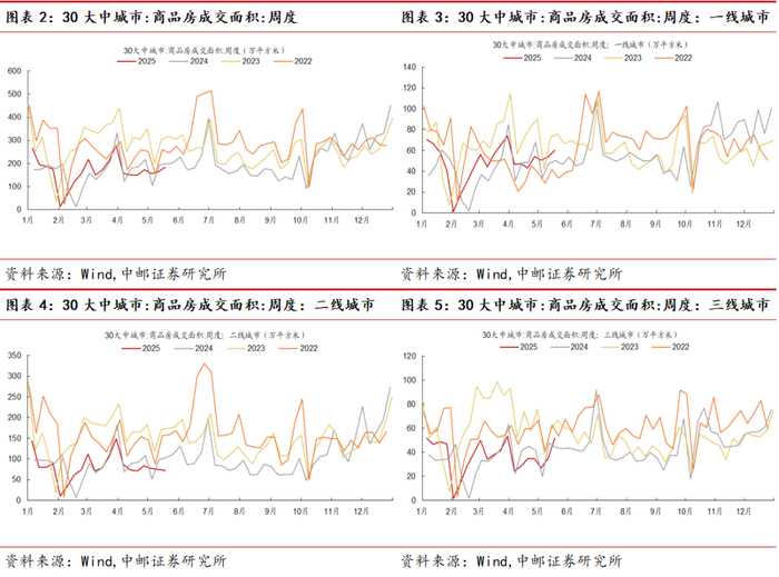 从同比增速来看,5月商品房销售同比增速尚未转正,日均销售面积低于去年同期水平,一线城市和三线城市好于二线城市。截至5月23日,30大中城市商品房日均成交面积较2024年同期增长-2.11%,好于4月同比增速-12%,低于3月同比增速2%。其中,一线城市商品房日均成交面积较2024年同期增长20.95%;二线城市商品房日均成交面积较2024年同期增长-17.11%;三线城市商品房成交面积较2024年同期增长7.11%。