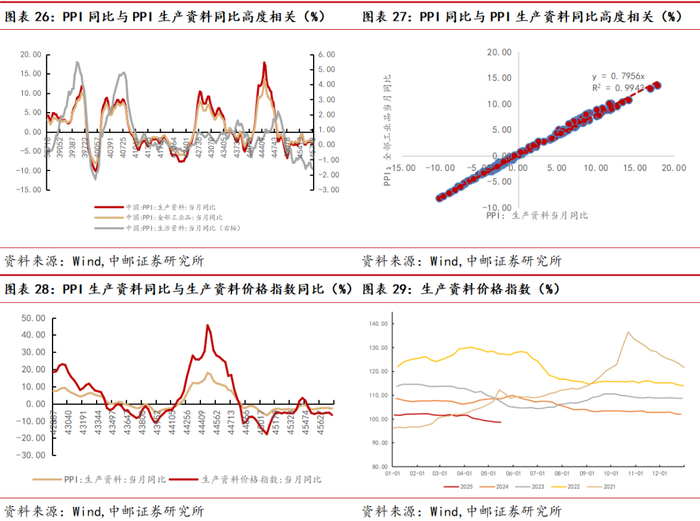 从历史数据来看,PPI当月同比增速与PPI:生产资料同比增速保持高度正相关,相关系数为0.7956,两者拟合曲线的拟合优度为0.9943,这意味着生产资料价格同比增速变动可以前瞻指示PPI当月同比增速的趋势。而PPI:生产资料同比增速与生产资料价格指数同比增速保持正相关,相关系数为0.4214,两者拟合曲线的拟合优度为0.9639,这意味着生产资料价格指数同比增速变动可以前瞻指示PPI:生产资料同比增速的趋势。因此,可以通过观察生产资料价格指数来观察PPI同比增速变化。