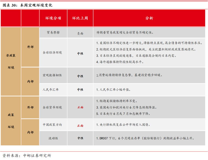 在政策环境方面,英国央行、欧洲央行和美联储短期降息预期有所降温;日本央行短期收紧货币政策概率亦有所下降;我国货币政策坚持适度宽松总基调,5月降准降息落地,央行择机恢复在公开市场买入国债。