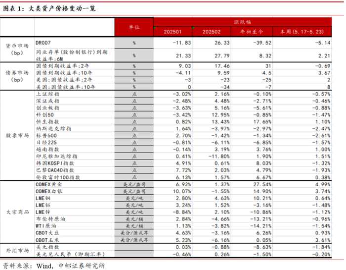 5月第4周(5.17-5.23),DR007小幅回落,或因降准降息影响,6个月同业存单(股份制银行)到期收益率上升,或因近期存款利率下行,银行负债端承压,转向同业存单市场;国债市场方面,短端利率下行,长端利率小幅上行期限利差有所扩大;全球主要经济体股票市场下跌,上证指数、深证成指微跌,纳斯达克综指和标普500较为明显下跌;商品市场走势分化,黄金、白银、铜价格上涨,而原油、铝、锌等价格下跌;外汇市场方面,美元指数下跌,人民币汇率小幅升值。