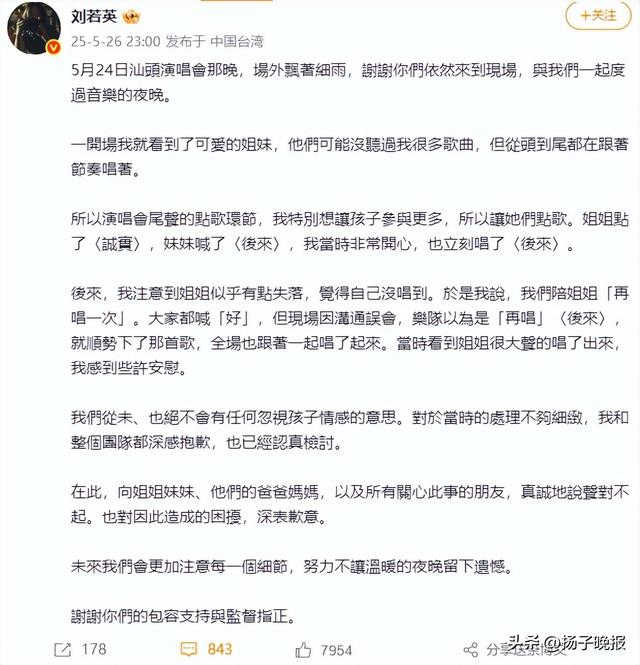5月26日深夜,刘若英发文道歉回应演唱会两姐妹点歌事件,称是想和姐姐再唱一次,但由于现场沟通误会,乐队以为是“再唱一次”《后来》。