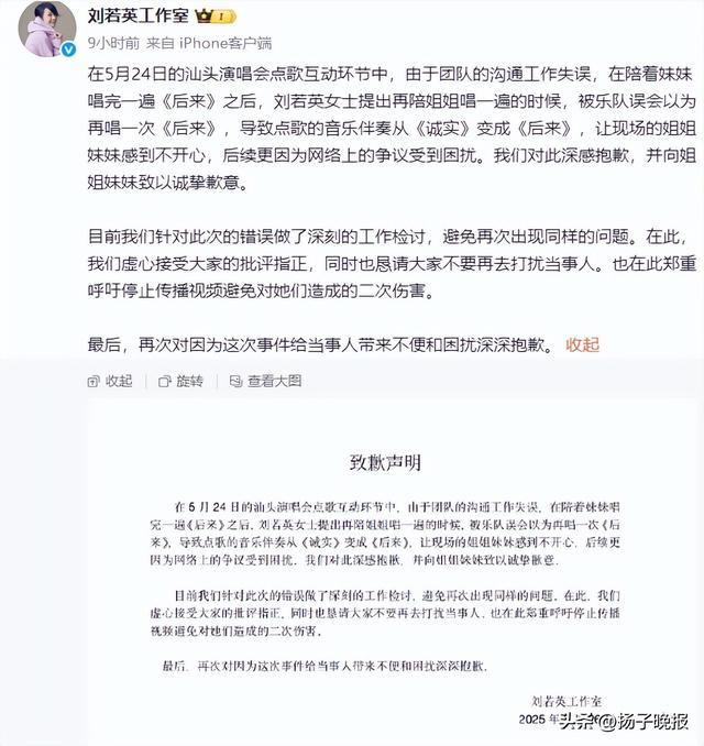 “在5月24日的汕头演唱会点歌互动环节中,由于团队的沟通工作失误,在陪着妹妹唱完一遍《后来》之后,刘若英女士提出再陪姐姐唱一遍的时候,被乐队误会以为再唱一次《后来》,导致点歌的音乐伴奏从《诚实》变成《后来》,让现场的姐姐妹妹感到不开心,后续更因为网络上的争议受到困扰。我们对此深感抱歉,并向姐姐妹妹致以诚挚歉意。”