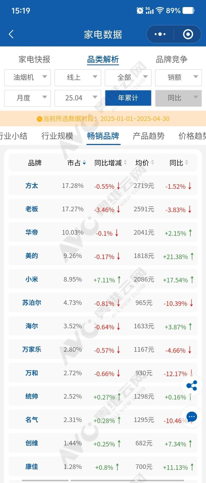 小米的崛起堪称最大黑马。钉科技注意到,其油烟机销售额市占率从2024年同期的不足2%跃升至8.95%,超越苏泊尔、海尔等传统品牌,直逼美的(9.26%)。这一成绩背后是小米“智能家居生态链”的持续发力:2086元的均价同比上涨17.54%,表明其产品已脱离低价标签,转向“高性价比+智能互联”路线。结合小米在彩电、空调领域的成功经验,其通过IoT技术打通厨房场景的“野心”十分明显。