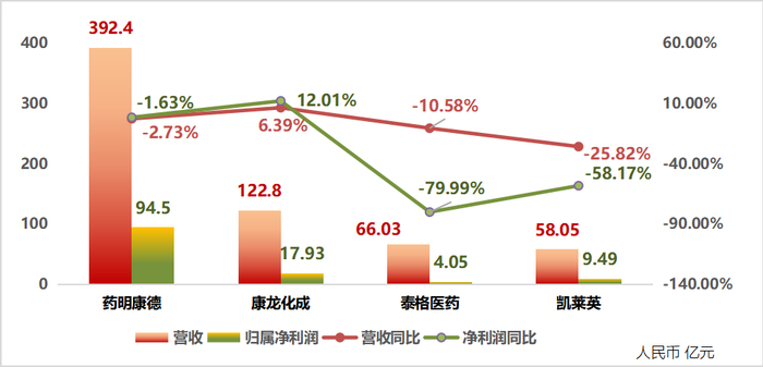 3、凯莱英营收58.05亿元,同比下降25.82%,净利润9.49亿元,同比下滑超50%。