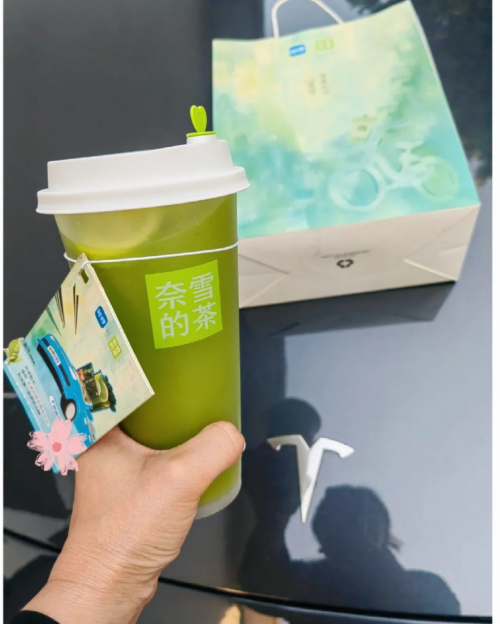 五分钟后,五个人挤在电梯里,工牌在胸前叮当作响,活像一群翘班的中学生。推开奈雪门店的玻璃门,奶茶香混着咖啡机运作的嗡嗡声扑面而来,但我们的目光瞬间被柜台后的联名限定杯锁定——杯身是奈雪经典的水墨风插画,撕拉区却暗藏玄机:轻轻一撕,哈啰租车的热门车型图案跃然眼前。有人抽到“小蓝车”涂装,有人翻出SUV轮廓,而我的杯身上,一辆流线型轿跑的剪影在阳光下泛着金属光泽。