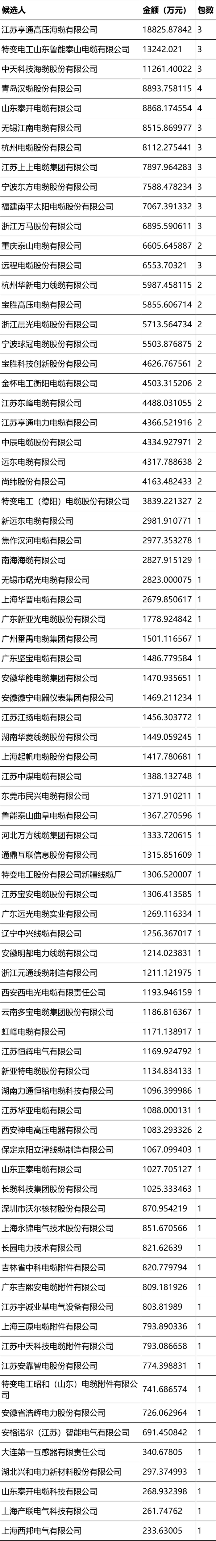 据统计,共有77家电缆企业中标,中标金额超过1000万的有60家,最高中标金额1.88亿元,合计中标金额约24.18亿元。