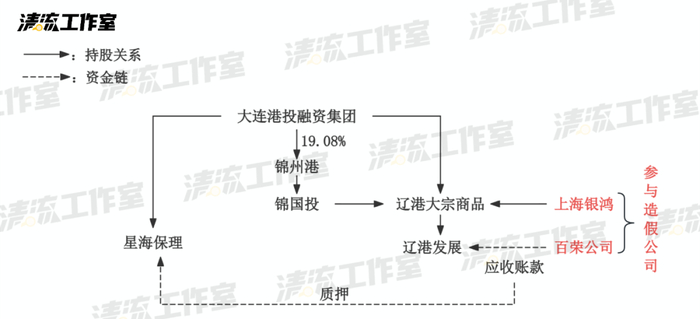 清流工作室发现,大连港投融资集团与造假核心公司锦国投设有合资公司辽港大宗商品交易有限公司(下称“辽港大宗商品”),后者由大连港投融资集团持有30%股权,参与造假的贸易公司上海银鸿持股25%,而锦国投的全资子公司持股10%。
