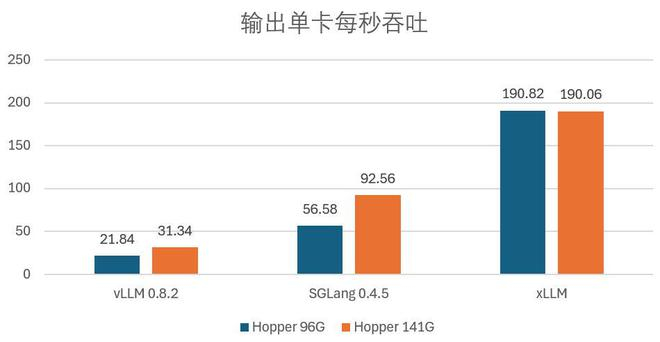Token 输入 3500: 输出 1500 时,xLLM 与两款主流开源框架在 Hopper 96G/141G 上的输出单卡每秒吞吐 TPS