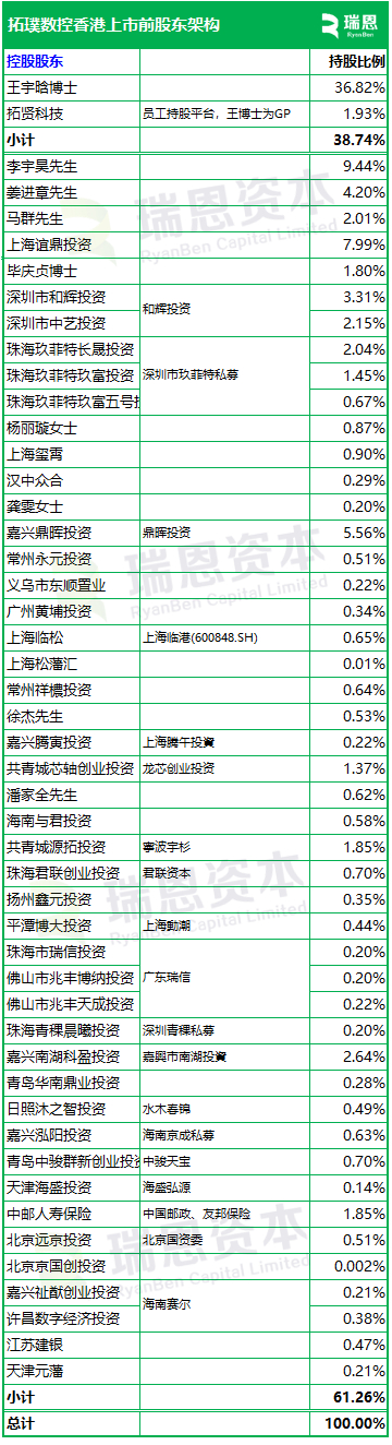 王宇晗博士,直接持股36.82%,以及其作为普通合伙人控制的员工持股平台拓贤科技持股1.93%。王博士合计可控制38.74%的股份。